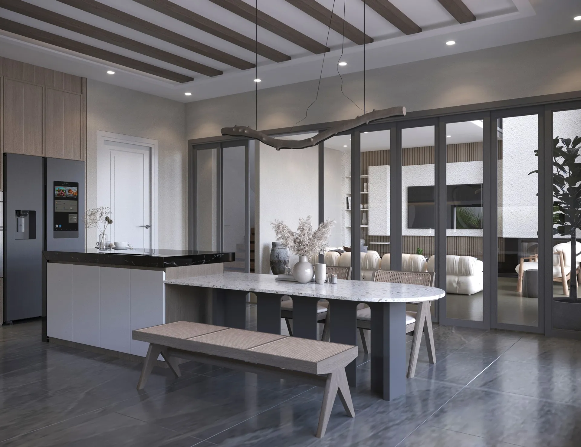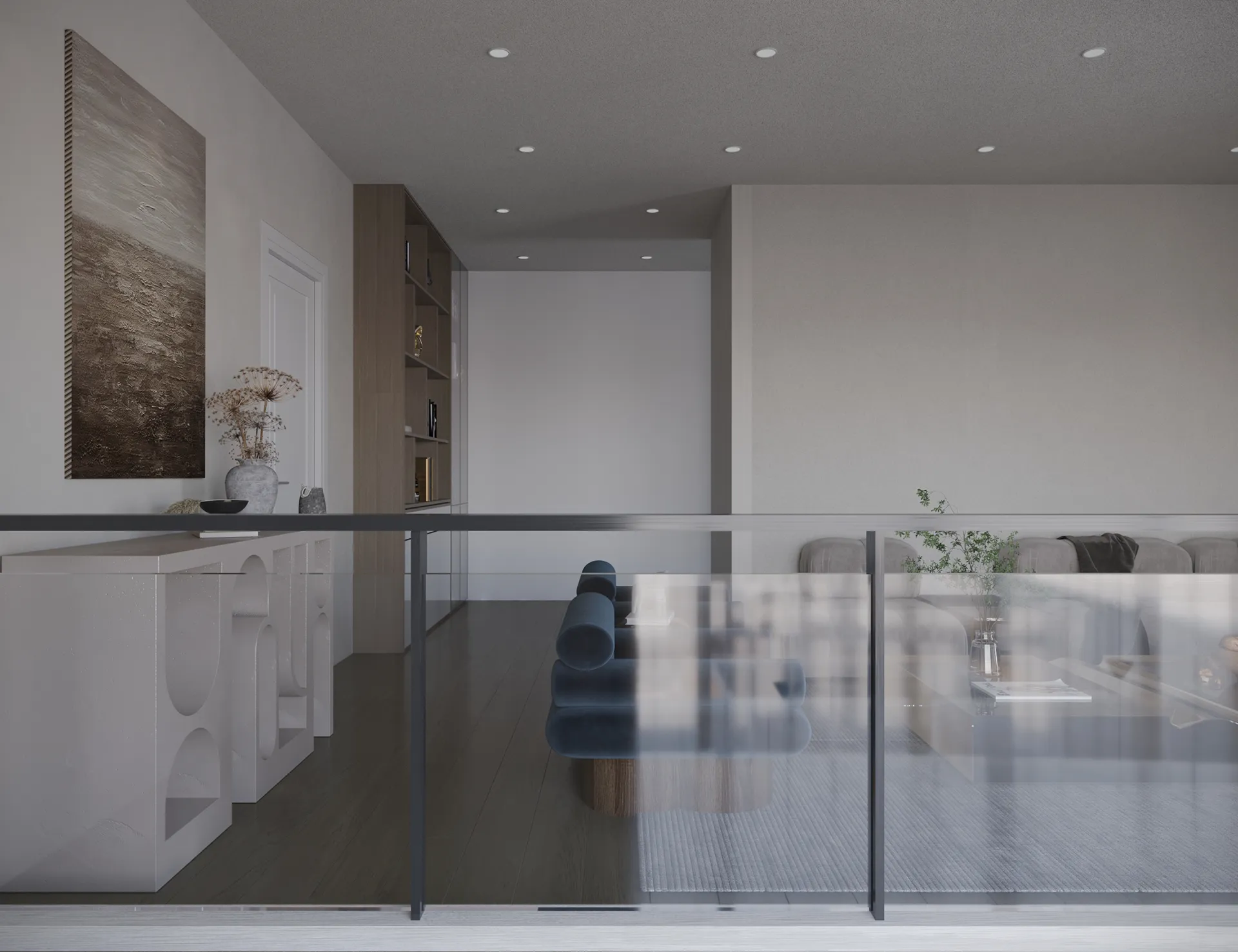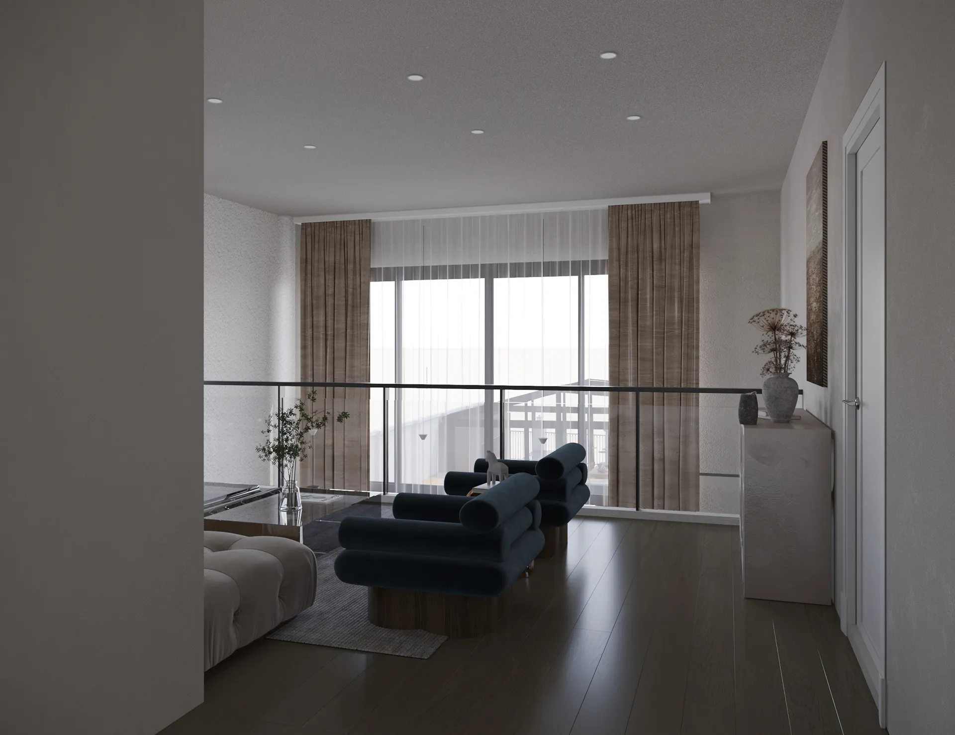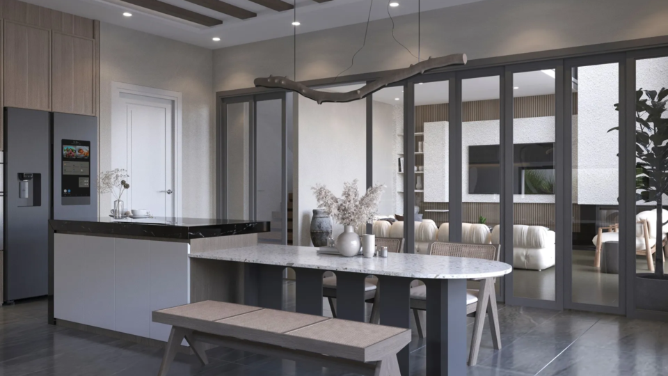Yıldırımcan ailesi için tasarladığımız bu villada, modern mimarinin net çizgilerini bohem ve doğal tasarımın sıcaklığıyla bir araya getirdik. Yüksek tavanlı, şömineli ferah yaşam alanını, cam galeri boşluğuyla bağlanan daha samimi bir dinlenme katıyla zenginleştirdik. “Japandi” stilinin huzurunu yansıtan, doğal desenli ve rattan detaylı ebeveyn süiti ile cesur adaçayı yeşili ve mermer dokuların öne çıktığı banyolar, bu projeyi ailenin kişisel huzur vahası haline getirdi. Her köşesi özenle düşünülen bu yuvada, Yıldırımcan ailesine mutlulukla dolu anılar biriktirmelerini dileriz.