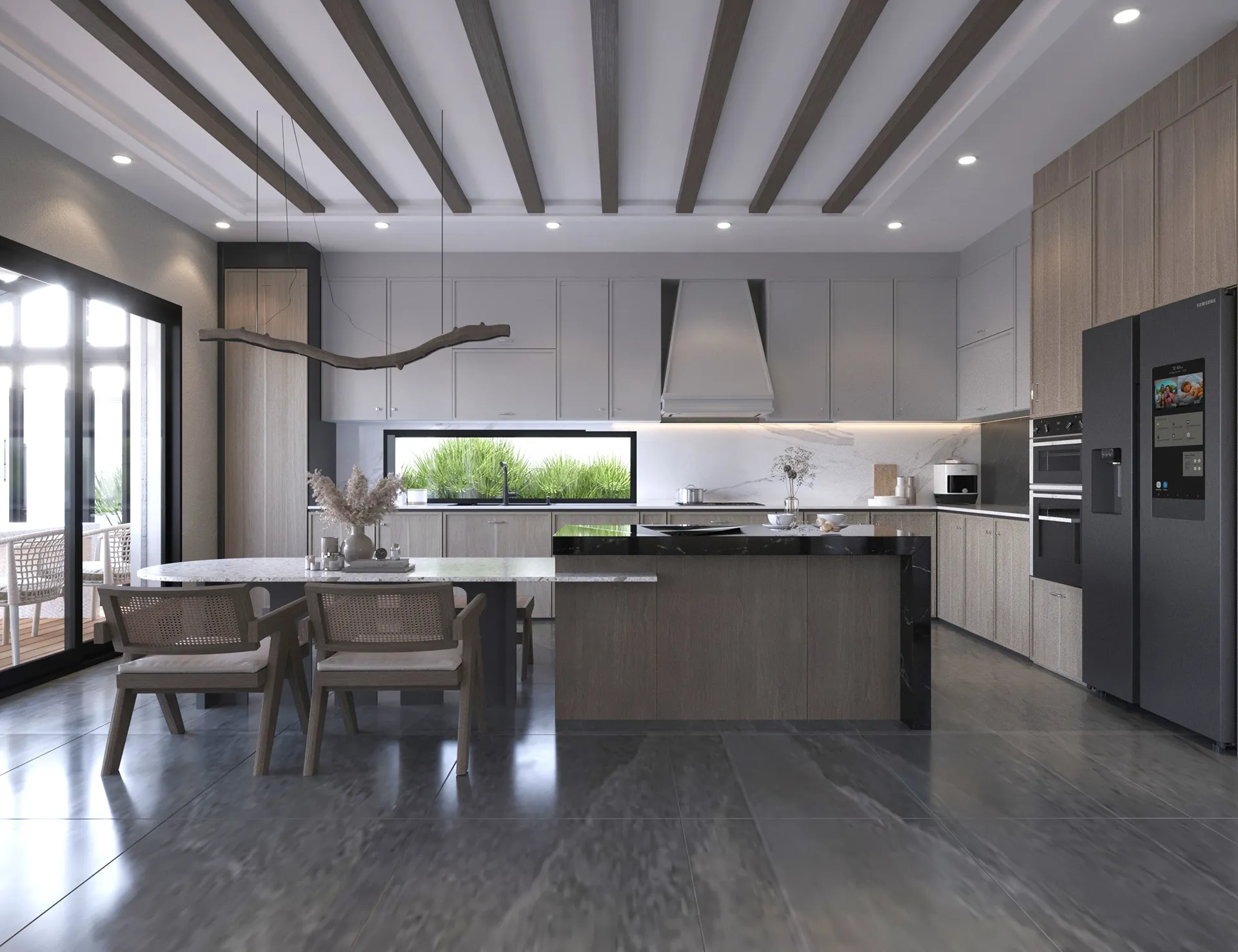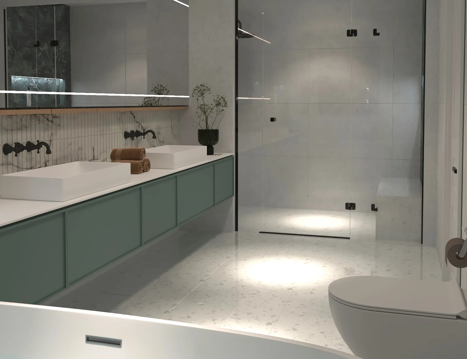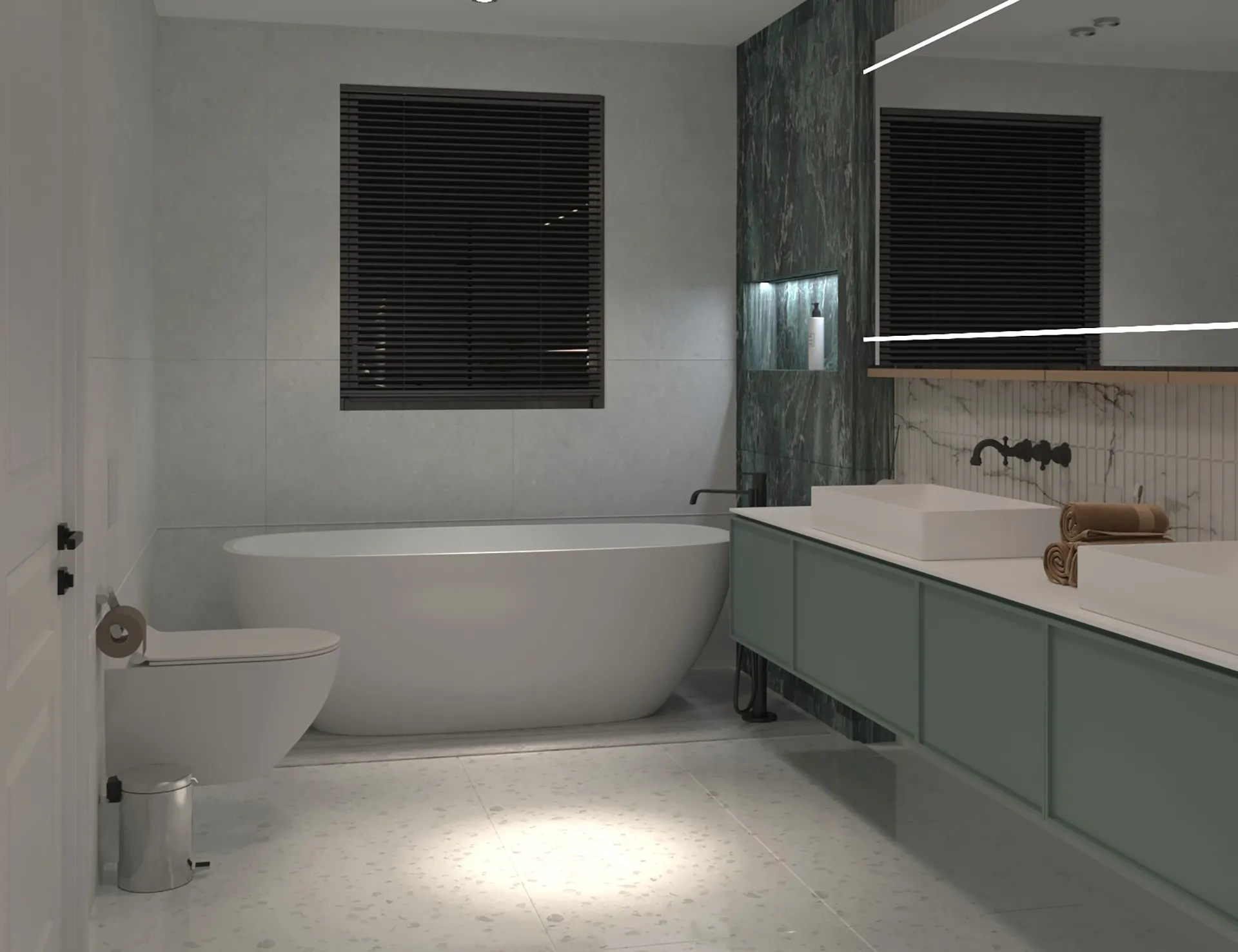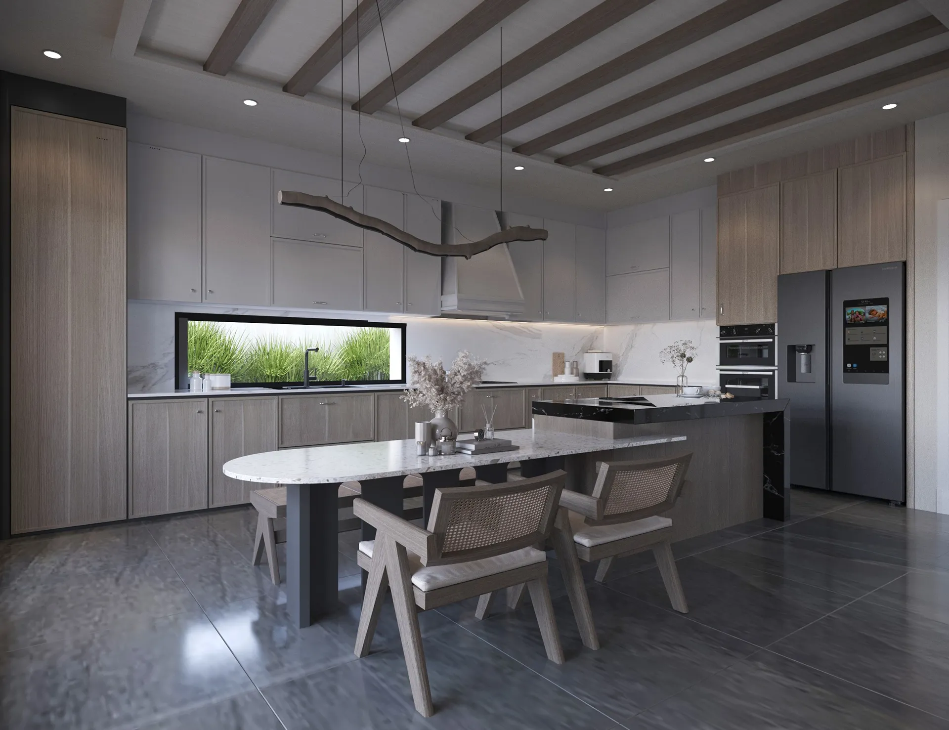 Yıldırımcan ailesi için tasarladığımız bu villada, modern mimarinin net çizgilerini bohem ve doğal tasarımın sıcaklığıyla bir araya getirdik. Yüksek tavanlı, şömineli ferah yaşam alanını, cam galeri boşluğuyla bağlanan daha samimi bir dinlenme katıyla zenginleştirdik. “Japandi” stilinin huzurunu yansıtan, doğal desenli ve rattan detaylı ebeveyn süiti ile cesur adaçayı yeşili ve mermer dokuların öne çıktığı banyolar, bu projeyi ailenin kişisel huzur vahası haline getirdi. Her köşesi özenle düşünülen bu yuvada, Yıldırımcan ailesine mutlulukla dolu anılar biriktirmelerini dileriz.